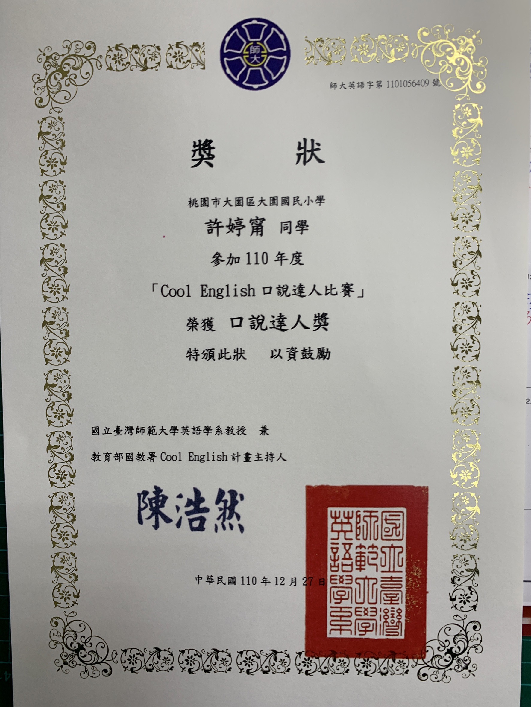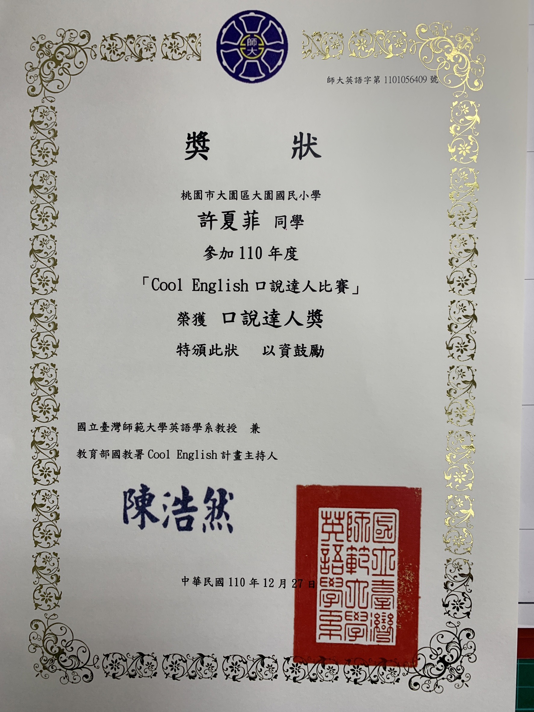 參加110年度「Cool English 口 說達人」榮獲口 說達人獎