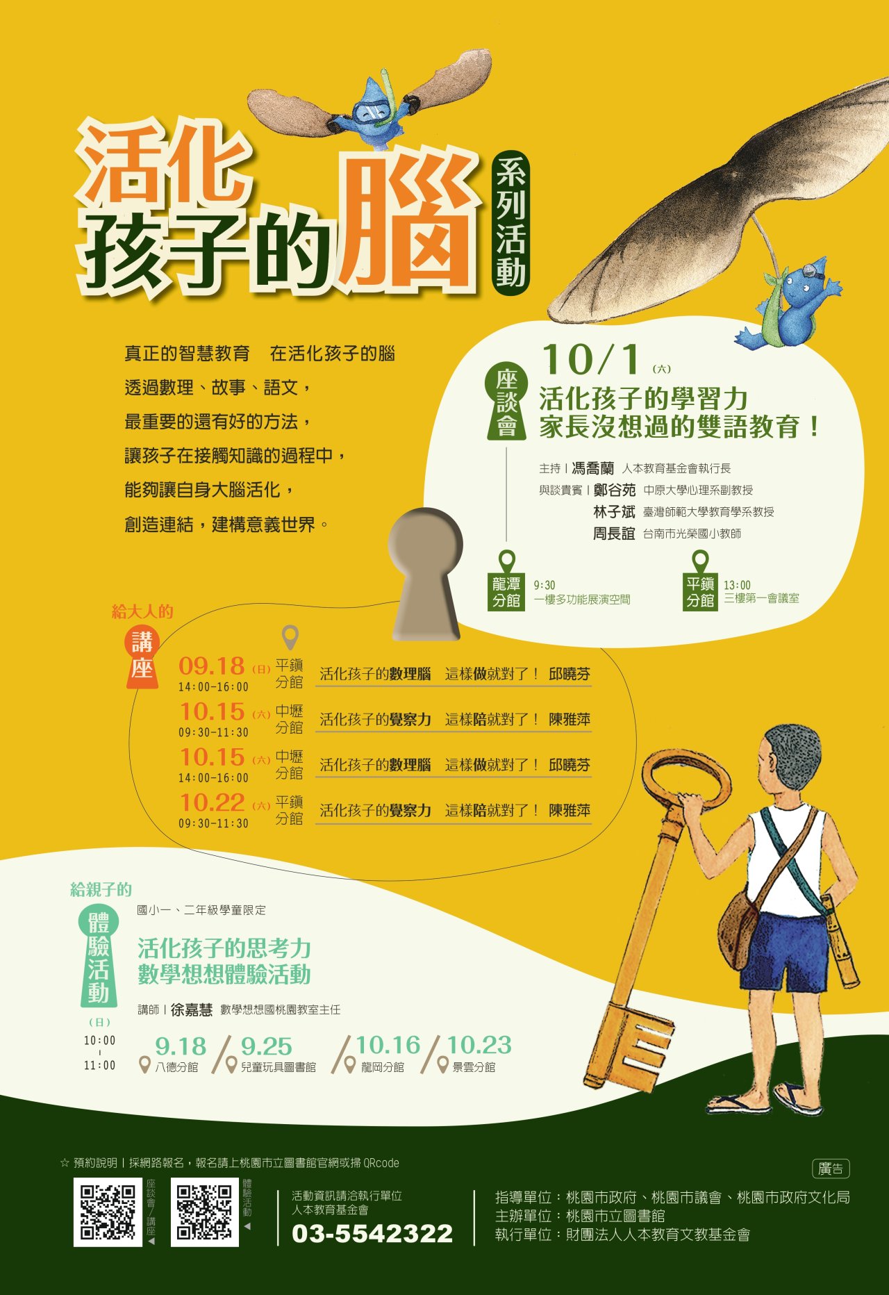 一、為協助親子正面迎向數理學習、雙語教育,本館與人本教 育基金會合作舉辦「活化孩子的腦」系列活動,包含座談 會、講座、提供親子家庭互動的體驗課程,協助家長掌握 知識的本質以及學習的關鍵。