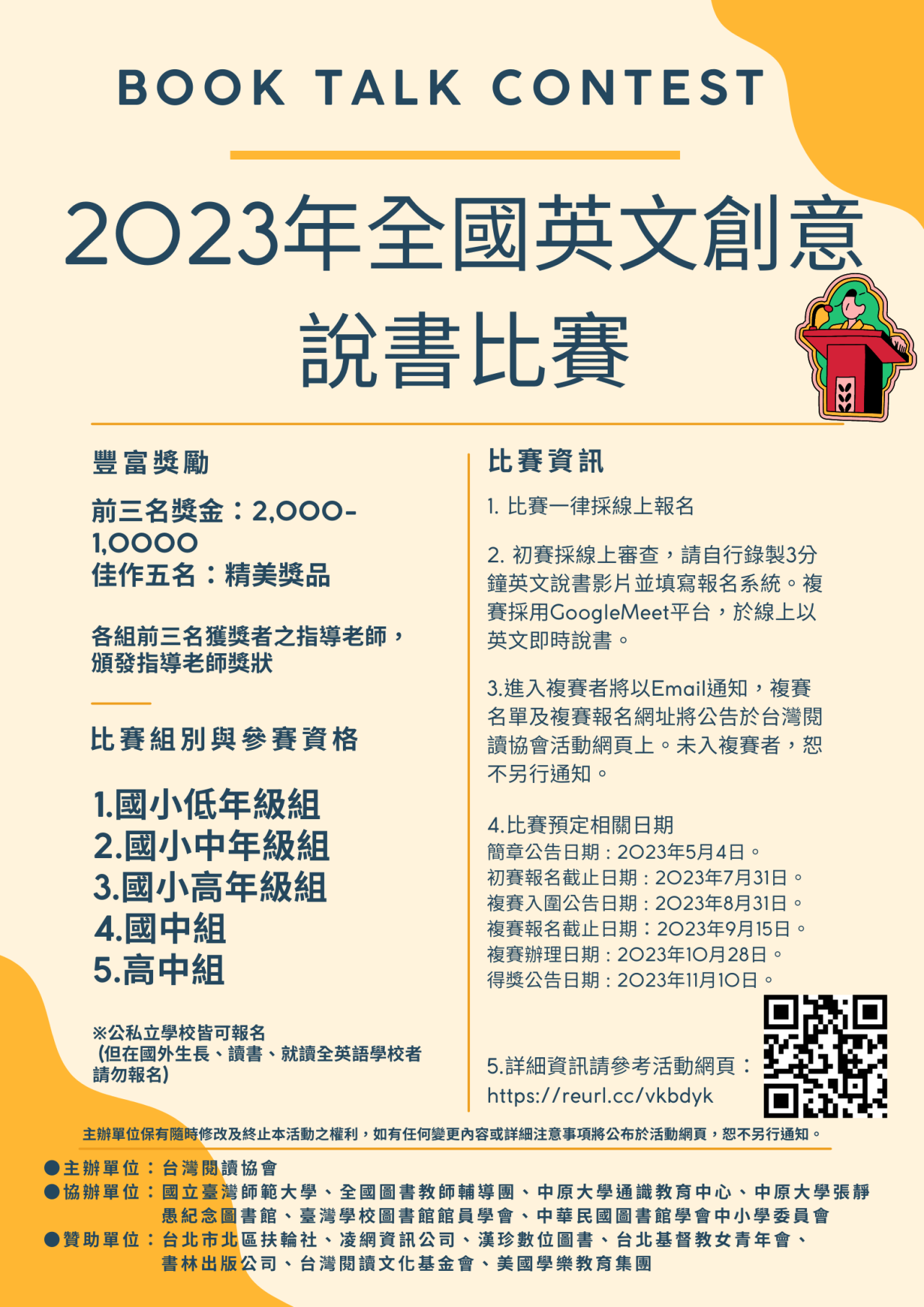 一、本案係台灣閱讀協會舉辦「2023全國英文創意說書比賽」,結合雙語教育及閱讀教育,今年已邁入第二屆,為鼓勵各級學校學生參與及教師指導,主辦單位備有前三名新臺幣2,000元整至1萬元整獎金及佳作五名致贈精美獎品;各組前三名獲獎學生之指導老師頒發獎狀。