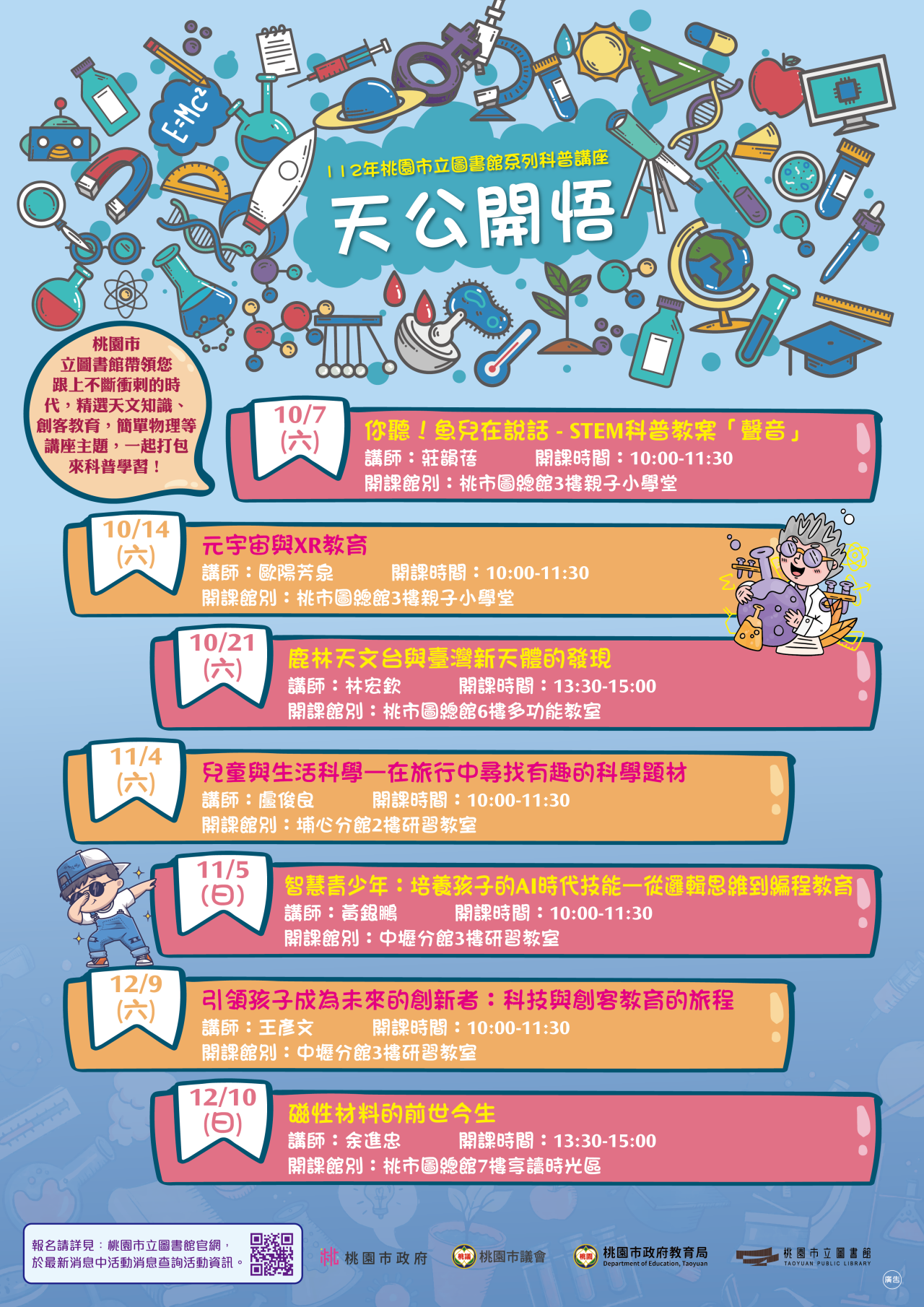 一、隨著科技的快速發展,社會正面臨一個充滿挑戰和機遇的時代,本館將舉辦一系列的科普講座,講座包括STEAM教育、天文教育、簡單物理等多元主題,歡迎老師、學生及民眾參與,期望帶讀者們了解相關科普知識和技能,提升人們的科學素養,以因應現代的挑戰!