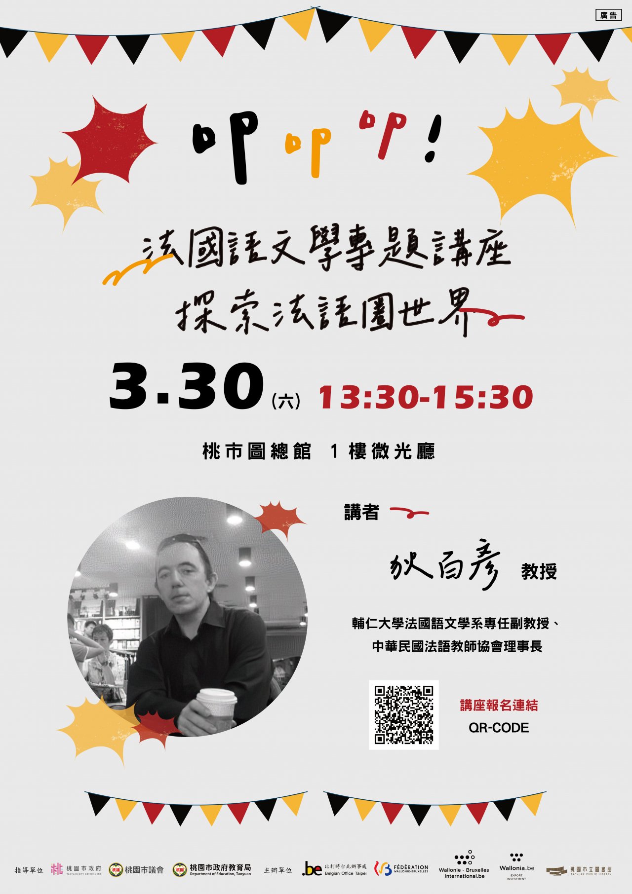 二、旨案系列活動於113年3月30日下午1時30分,邀請輔仁大學法國語文學系專任副教授、中華民國法語教師協會理事長狄百彥先生,講述「探索法語圈世界」,本場次講座適合國中以上年齡層及教師參與並有安排逐步口譯,場次皆已登錄全國教師在職進修資訊網,教師可申請研習時數,敬請貴機關協助宣傳,鼓勵所屬同仁、學生與民眾踴躍參加。