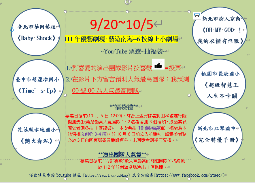 二、 因應今年表演藝術類競賽活動因新冠肺炎無法現場聆賞,國立臺灣藝術教育館(以下稱藝教館)特地舉辦旨揭活動,邀請創意戲劇比賽優秀團隊至該館南海劇場演出錄影,以網路播映方式,於111年9月20日起至10月5日在該館官方臉書及YouTube頻道隆重播映,歡迎親師生藉由線上平臺欣賞學生們的創意優質戲劇,以培養其藝術涵養並激發其藝術創作潛能。