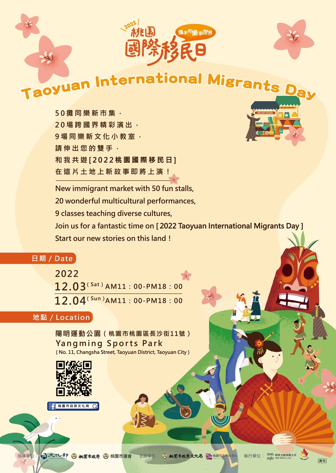 二、 該局因應新住民人口成長,致力推動文化平權,爰於111年12月3日至4日於桃園區陽明運動公園辦理「2022桃園國際移民日」活動,共計16場國際性與在地特色兼具的精采演出,4場新住民參與其中的主題劇場,9場異國文化的互動小教室,還有40攤異國chill市集,打造桃園成為多元文化共融的友善宜居城市。