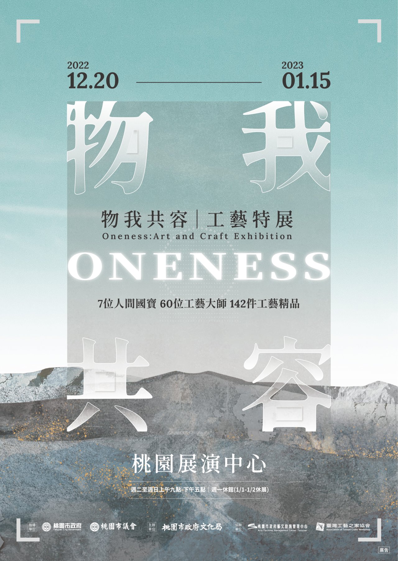 一、 本市為推廣工藝之美辦理「物我共容 工藝特展」,取自莊子「物我合一」的思想精神,創造生活共容的工藝美學,反映國門之都的桃園多元、自由、包容的城市特色。邀請全臺60位工藝大師參展,包含7位人間國寶,共142件作品展出以及16場假日工藝手作、講座免費報名,詳細展資訊及活動報名可上「桃園有藝思」粉絲專業查詢:https://www.facebook.com/art.in.taoyuan。