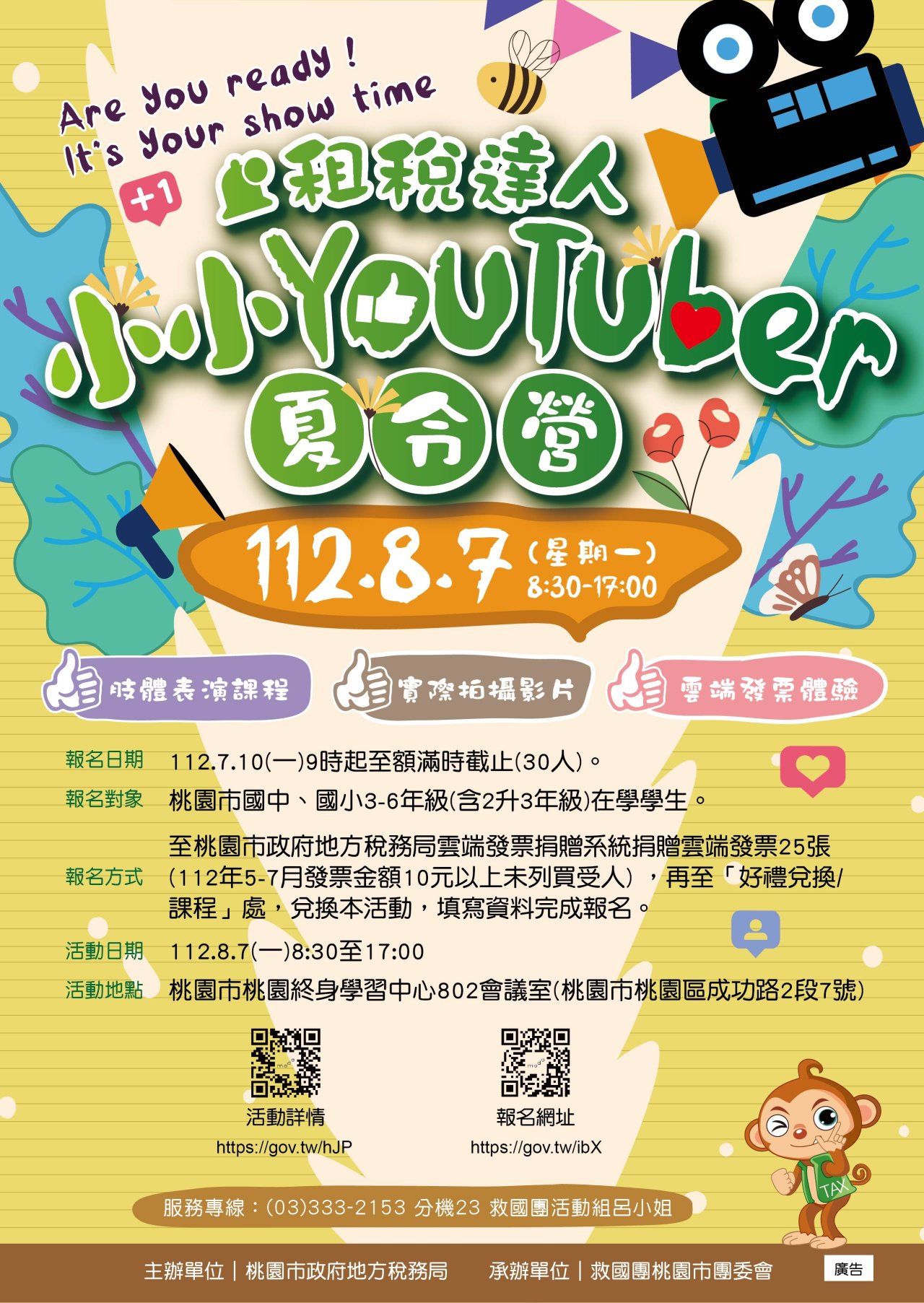 一、旨揭活動以學員體驗成為小小YouTuber為主題,安排教育訓練課程、實地演練及拍攝影片,教導學員瞭解如何分工合作、角色扮演、提升肢體及口語表達能力,並將稅務觀念融入於活動中,報名及活動資訊如下: