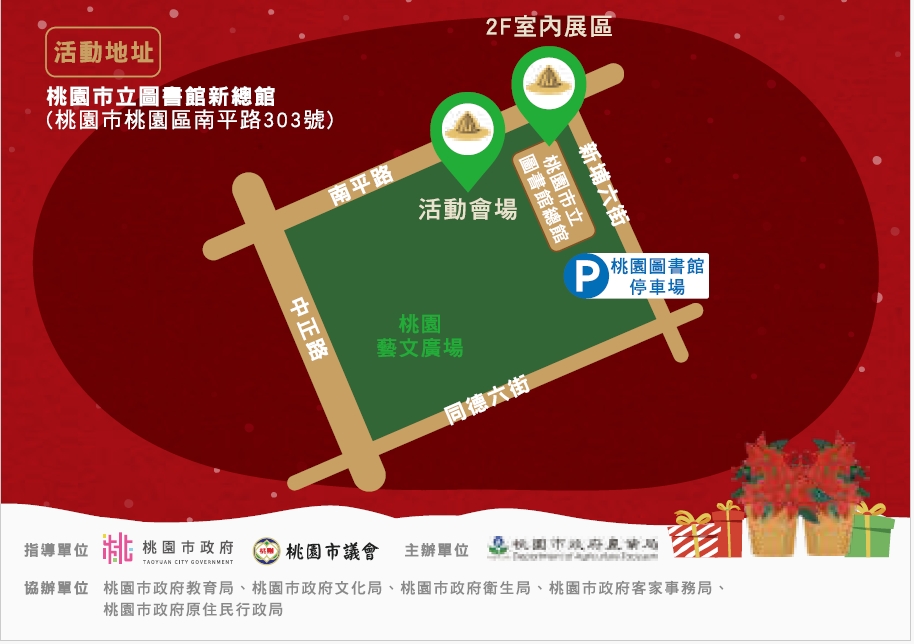 2、室外展區(食農市集及舞台活動):下午2點至8點。 (二)地點:桃園市立圖書館新總館2樓展廳及戶外廣場。