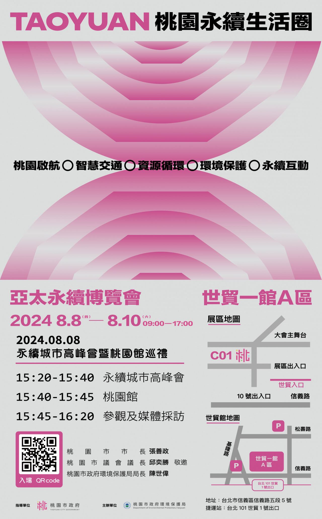 二、為展現桃園實踐永續發展、淨零碳排等作為,本府參與台 灣永續能源研究基金會(TAISE)舉辦之「2024亞太永續博 覽會」,於城市區以「TAOYUAN 永續生活圈」 作為桃園館 展場意象,帶領大家體驗桃園的啟航、城市的脈動,以及 淨零永續的生活。