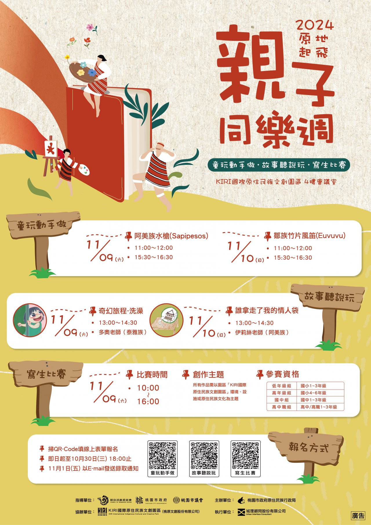 | (一) | 活動緣起:本次活動旨在透過富有互動性和趣味性的多元親子活動,帶領民眾認識原住民族文化,其中「童玩動手做」將由講師引導參與者製作原住民傳統童玩,展現原住民族對自然資源的巧妙運用和深厚的工藝技術;「故事聽說玩」將由講師精心挑選的繪本,帶領參與者以聽、說、玩的形式探索原住民族的歷史、習俗及生活方式;「寫生比賽」鼓勵參與者覺察「KIRI國際原住民族文創園區」景觀環境,再透過畫筆表達對周遭環境及原住民族文化的理解與感受。期盼一系列的親子活動促使參與者透過親身體驗增進對原住民族多元文化的理解與尊重,並促進社會文化交流與共榮。 |