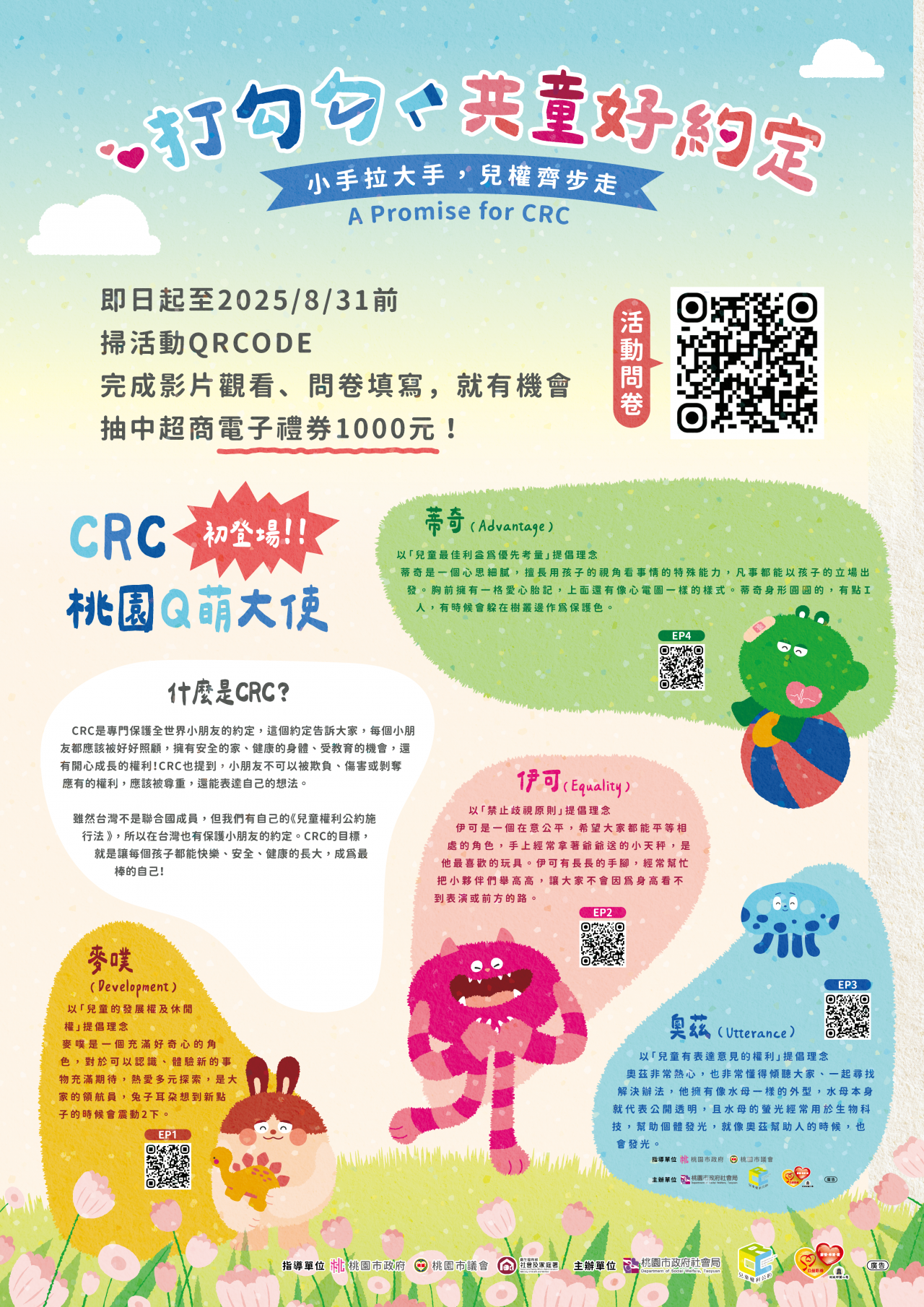 | 三、 | 本府社會局於113年誕生4個「桃園Q萌大使」角色,宣導CRC觀念,並完成4部講解以CRC四大原則為核心概念的動畫影片。於本年度進行社區宣導活動,期待將動畫作為教材推廣至本市市民,逐漸把CRC的精神融入生活當中。 |