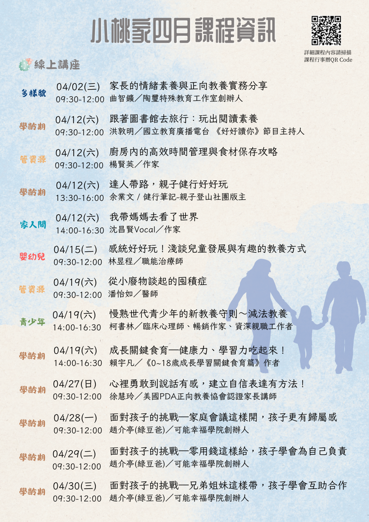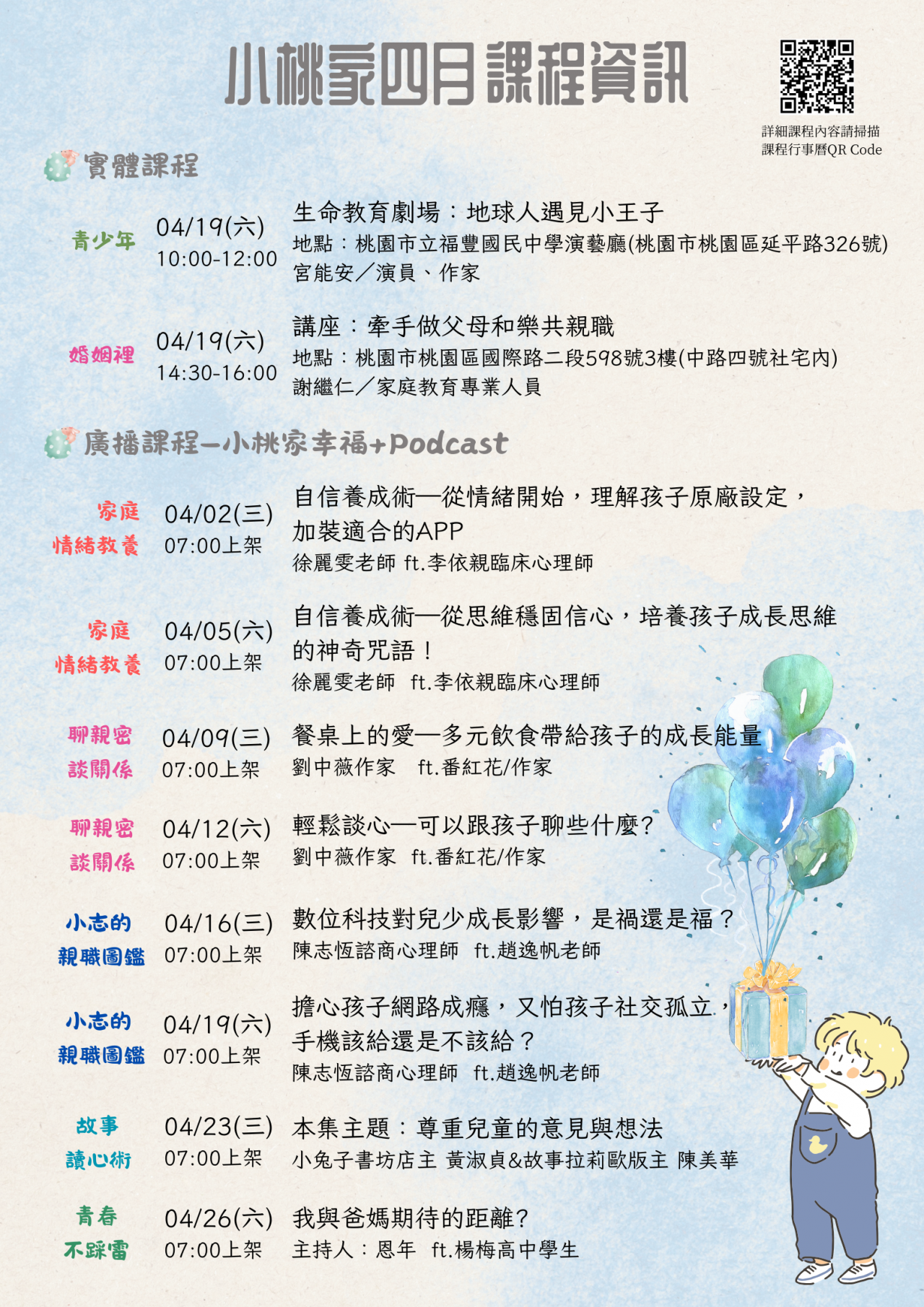 主旨:桃園市政府家庭教育中心檢送「小桃家4月課程資訊」、「用愛擁抱人生系列講座」海報各1份。