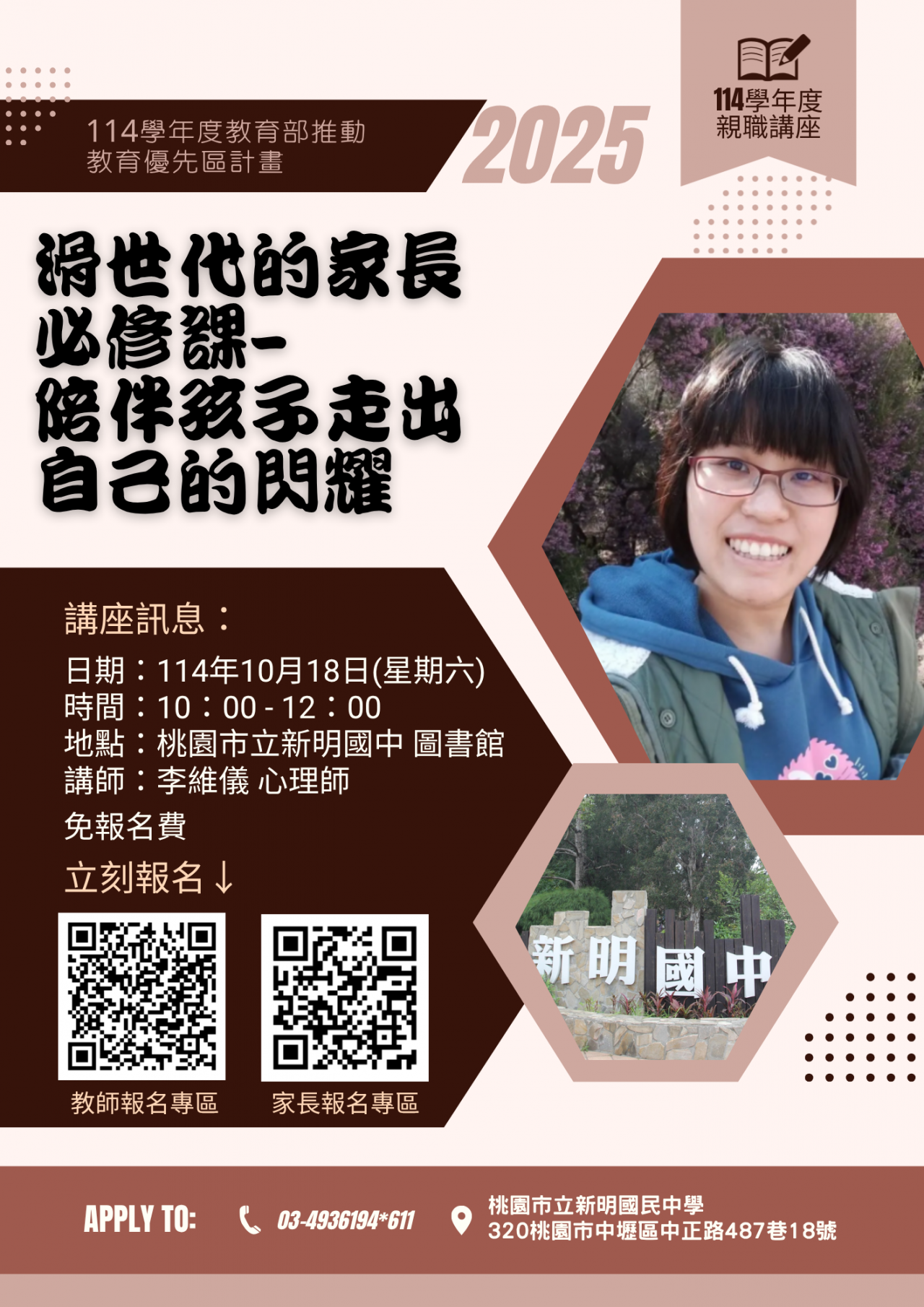 | 1、 | 教師請至「桃園市教育發展資源入口網」報名,全程參與者核予2小時研習時數,課程編號J00012-251000003。 |