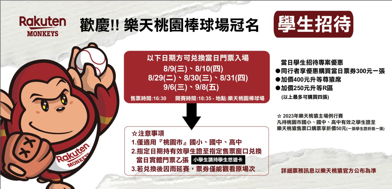 四、 | 此外,本季加碼回饋本市高、國中小學生持學生證至現場購票,每場次享票價折扣50元,歡迎市民朋友踴躍進場看球,共挺桃猿;為利民眾充分知悉活動資訊,請各校協助公告周知,鼓勵學生進場觀賽。 |