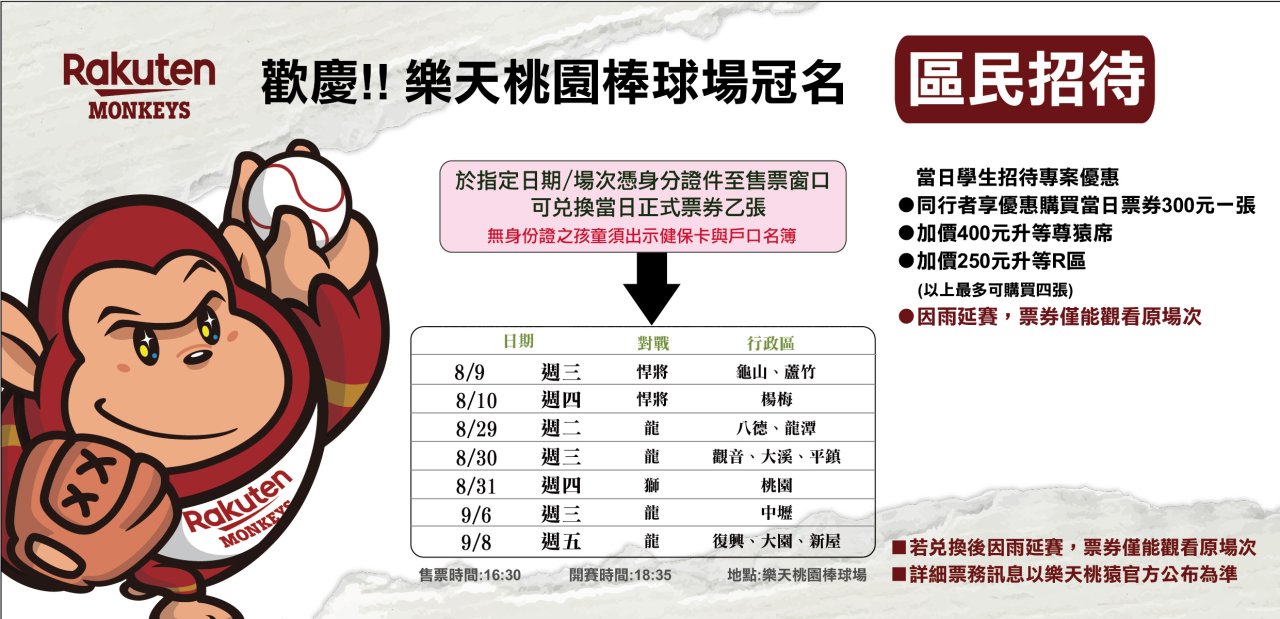 三、 | 樂天於112年8月起安排7場次免費招待桃園市民及桃園市高中、國中、國小學生免費進場觀賽,各行政區民眾可於各區優惠當日持身分證件(無身分證之孩童須出示健保卡及戶口名簿)至現場索取免費門票,學生則可持桃園市學生證至7場次現場索取免費門票,場次分別為8月9日(龜山、蘆竹)、8月10日(楊梅)、8月29日(八德、龍潭)、8月30日(觀音、大溪、平鎮)、8月31日(桃園)、9月6日(中壢)、9月8日(復興、大園、新屋)。 |