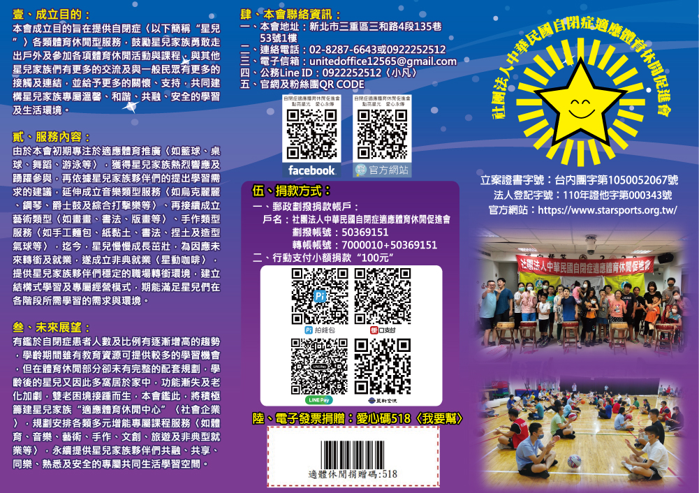 | 二、 | 本會長期致力於自閉症者〈以下簡稱“星兒”〉各項體育〈籃球、桌球、水適能、舞蹈等〉及休閒〈藝術創作、音樂培養、手作工藝等〉等服務,期能提供星兒家庭專屬合適的學習環境,不斷成長〈簡介單張如附件〉。 |