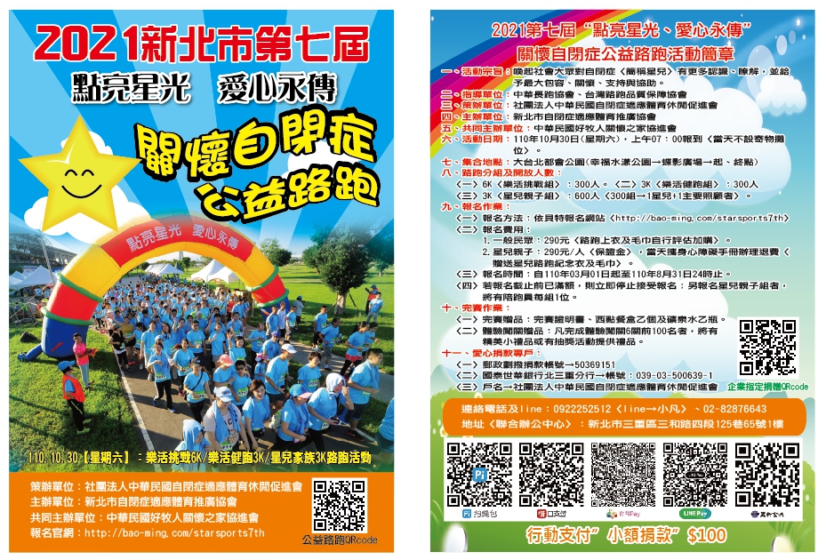 | 2、 | 星兒親子: 390元/人〈保證金〉,當天攜身心障礙手冊現場辦理退費〈贈送星兒路跑記念衣及毛巾〉。 |