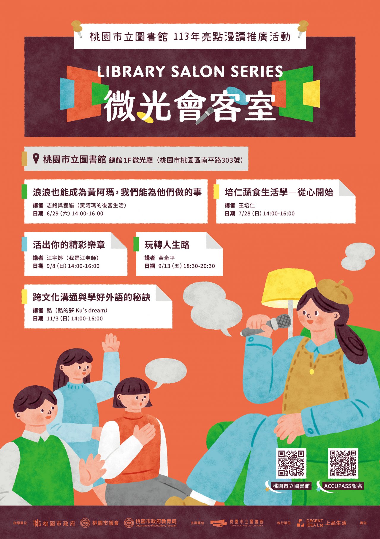 二、為活絡桃園閱讀城市形象,透過創意亮點行銷閱讀推廣,建立全齡化閱讀風氣,桃園市立圖書館於今(113)年6月至11月間辦理一系列講座,邀請市民朋友一起走進閱讀時光,開拓生活視野建立多元價值。
