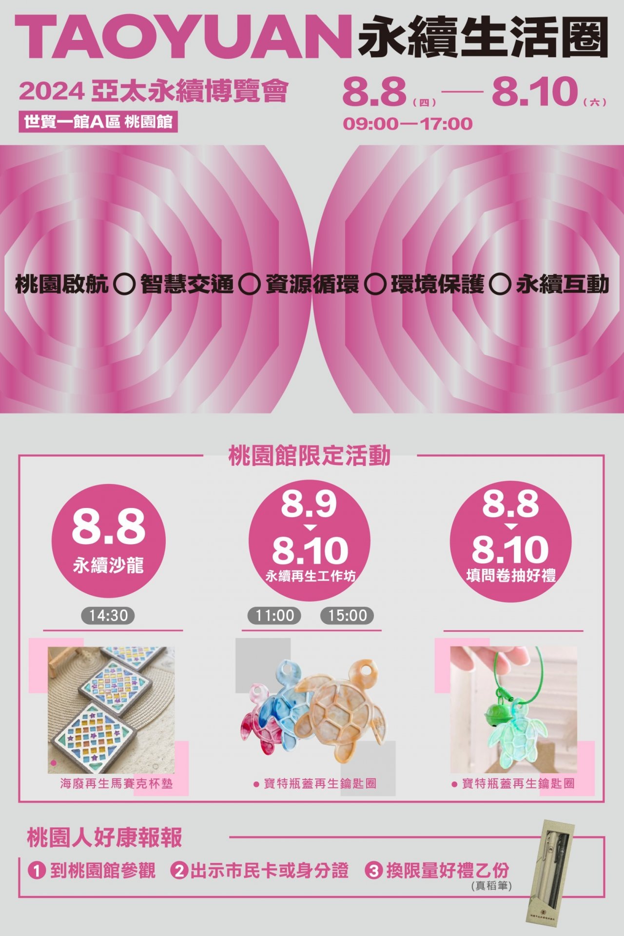 二、為展現桃園實踐永續發展、淨零碳排等作為,本府參與台 灣永續能源研究基金會(TAISE)舉辦之「2024亞太永續博 覽會」,於城市區以「TAOYUAN 永續生活圈」 作為桃園館 展場意象,帶領大家體驗桃園的啟航、城市的脈動,以及 淨零永續的生活。