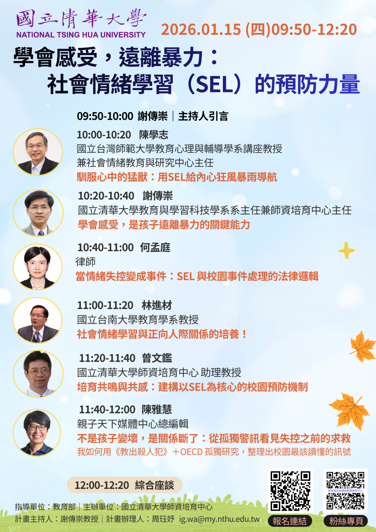 主旨:轉知國立清華大學師資培育中心辦理「學會感受,遠離暴力:社會情緒學習(SEL)的預防力量」線上論壇,請查照。